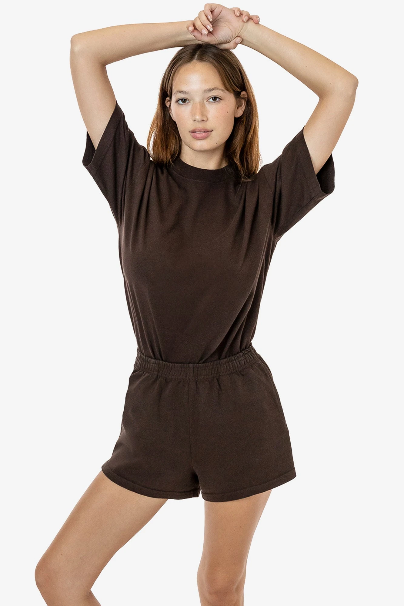 A feminine take on our Unisex Gym short. Perfect Short Shorts for the gym or your Sunday morning at home. These shorts are part of our garment dye line, which is always custom dyed, shrink-free and sewn with 100% USA-grown cotton.