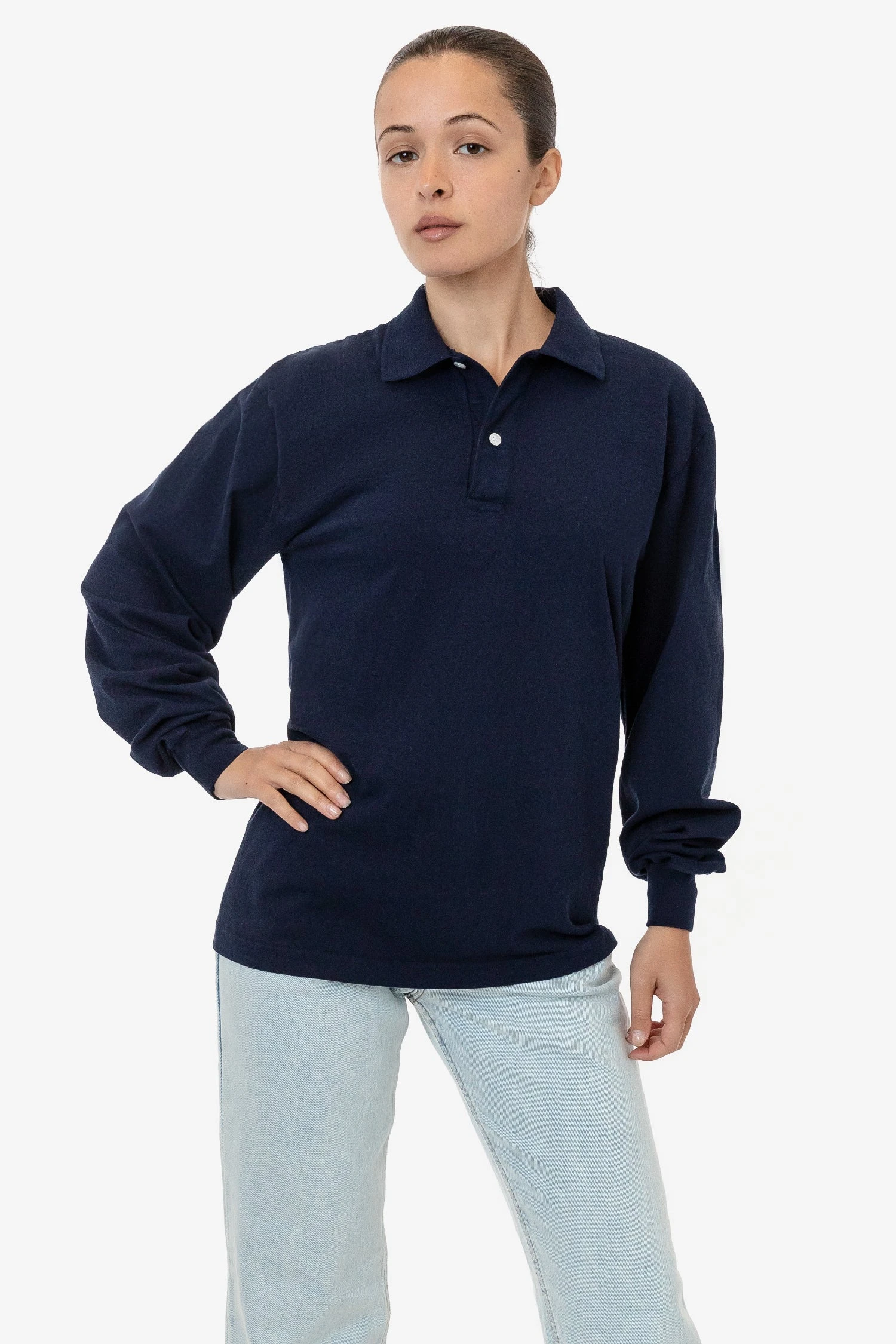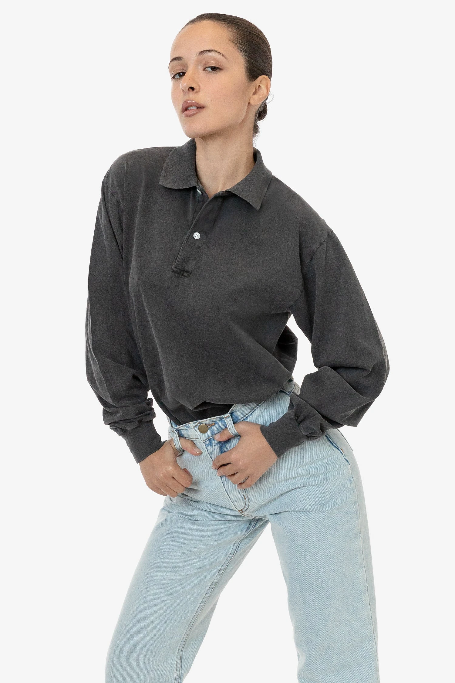 Our 18/1 long sleeve polo is made of our 6.5 oz. cotton jersey for everyday versatility. With the same generous fit, dropped shoulder and billowy sleeves as our best selling 1807GD Garment Dye Long Sleeve T-shirt, this collared take is finished with a 2-button placket for a casual feel. We spent months perfecting the details of this shirt and its stable collar to make sure you enjoy the feeling of wearing it. This golf collar polo is shrink-free as a result of garment dyeing and has a naturally broken-in texture.