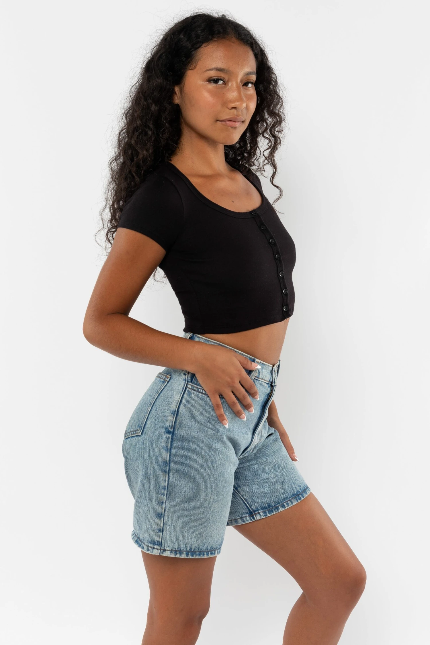This baby rib crop top features cap sleeves, a scoop neckline, and a true button front placket that can be worn partially or completely unbuttoned.