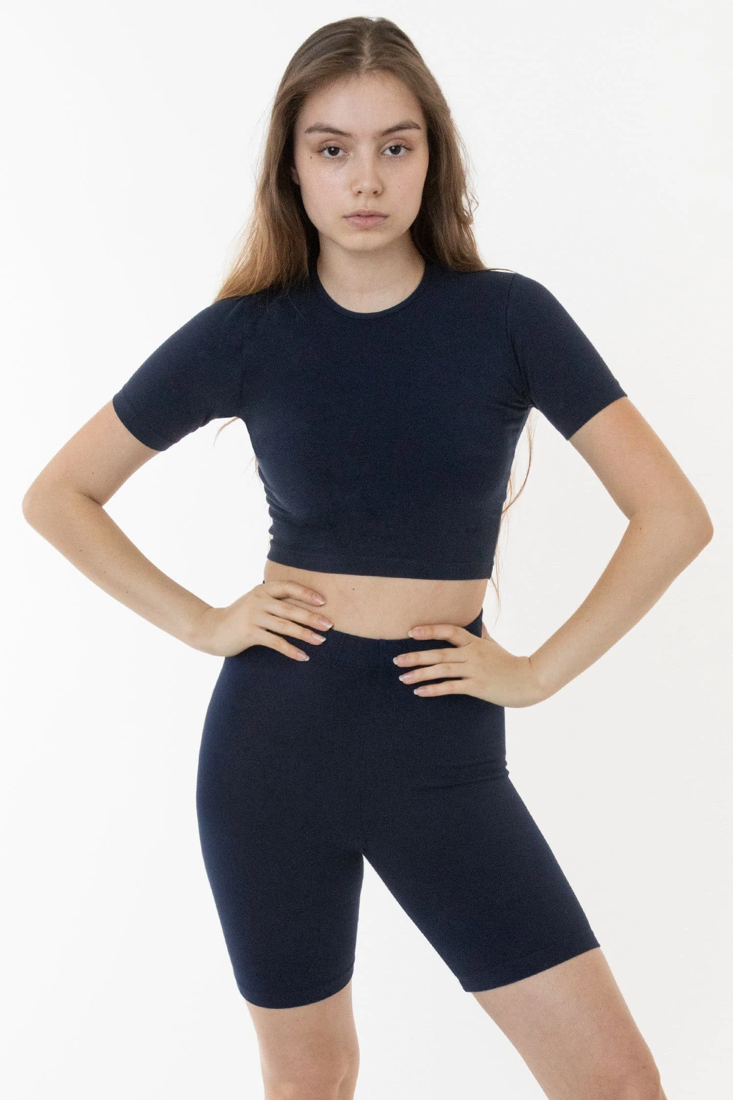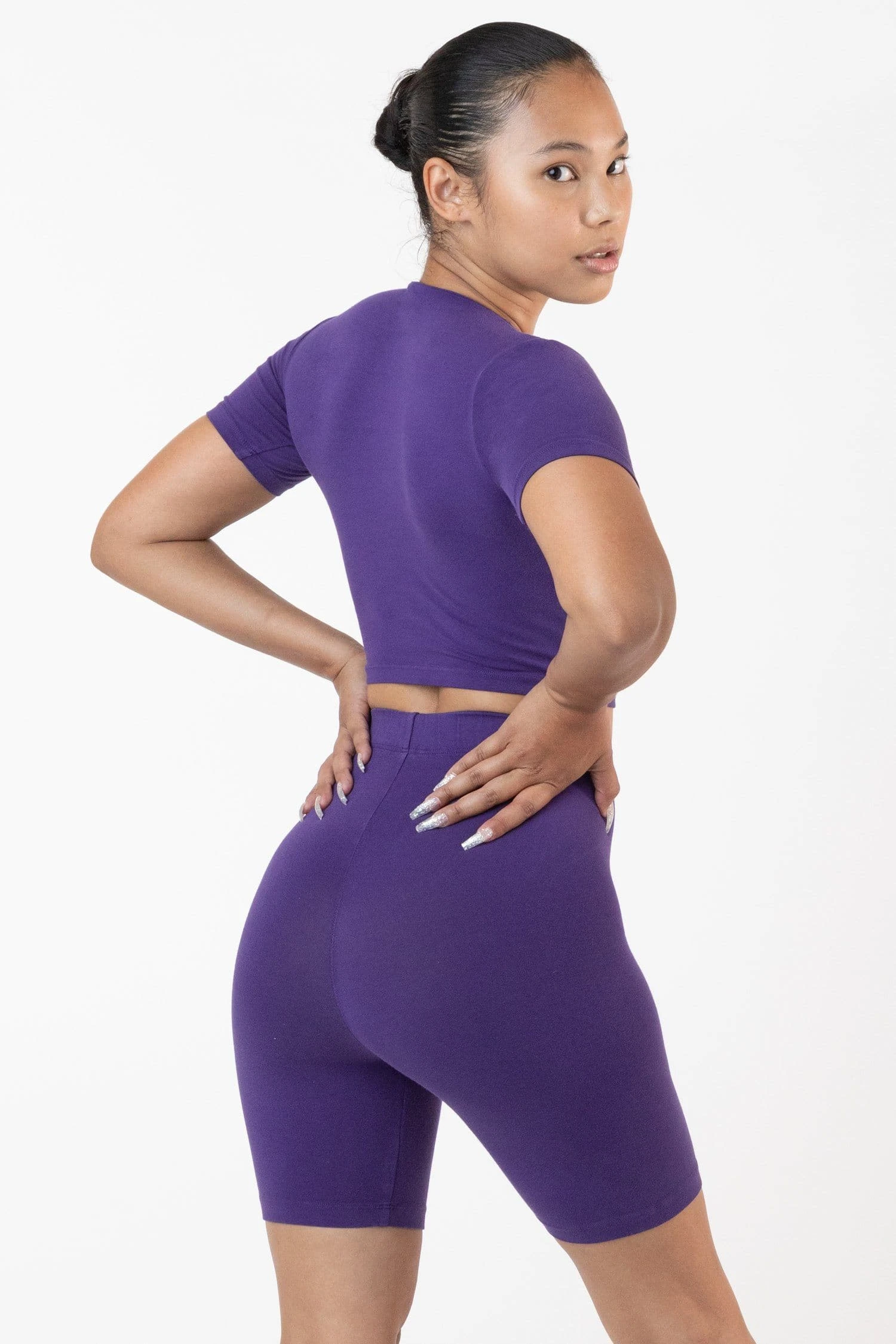 Our Garment Dye, Premium Cotton Spandex Bike Short is made of a heavyweight cotton spandex with extra compression and as been garment dyed and enzyme washed providing unique colorways and rich texture. This style is thicker and more opaque than our classic bike short with a smooth luxurious hand-feel. Featuring a mid-thigh length and 1.5″ elastic waistband that gives you a secure feeling all day long. Pair this style with our Garment Dye Heavy Fleece Sweatshirt for a vintage sportswear look or with our matching Garment Dye Short Sleeve Crop Top. Made in South Central, Los Angeles by experienced seamstresses earning fair wages.