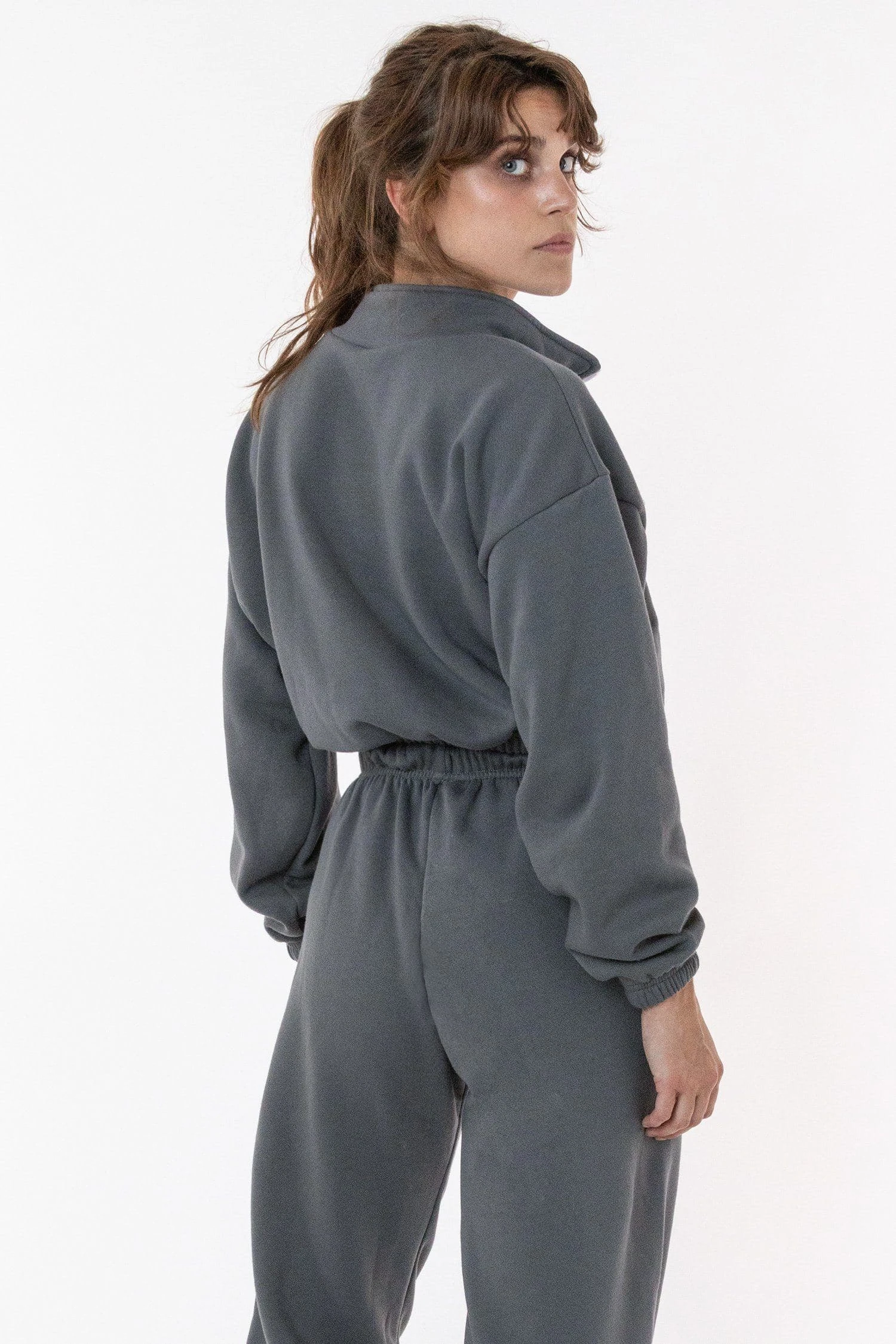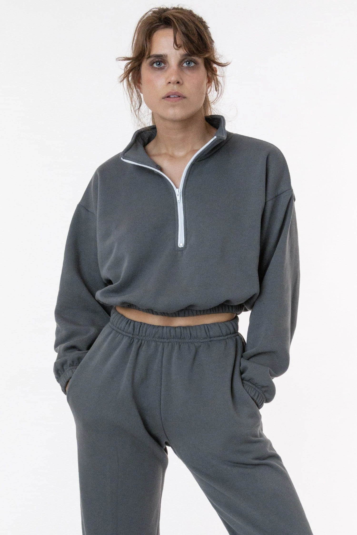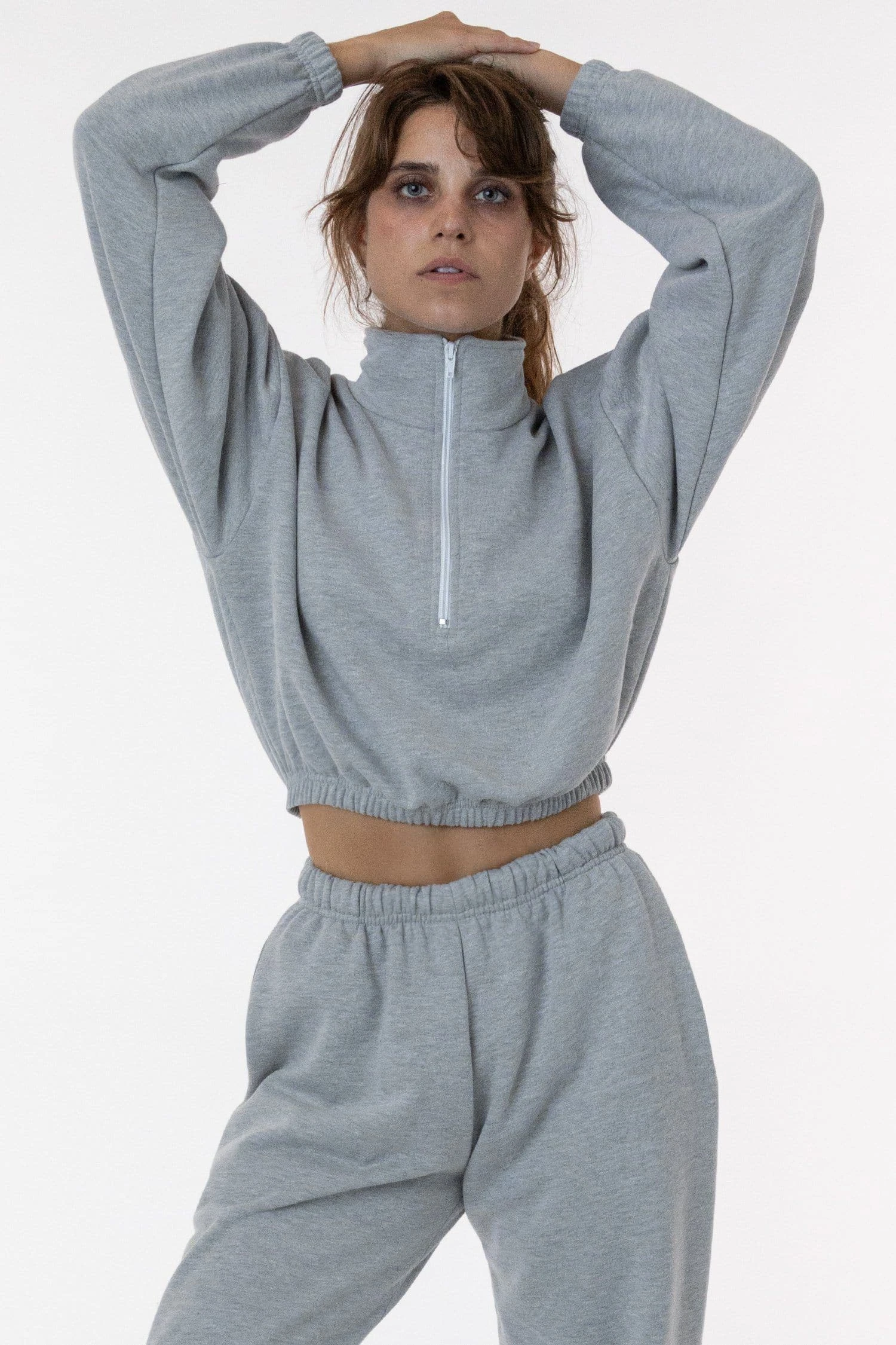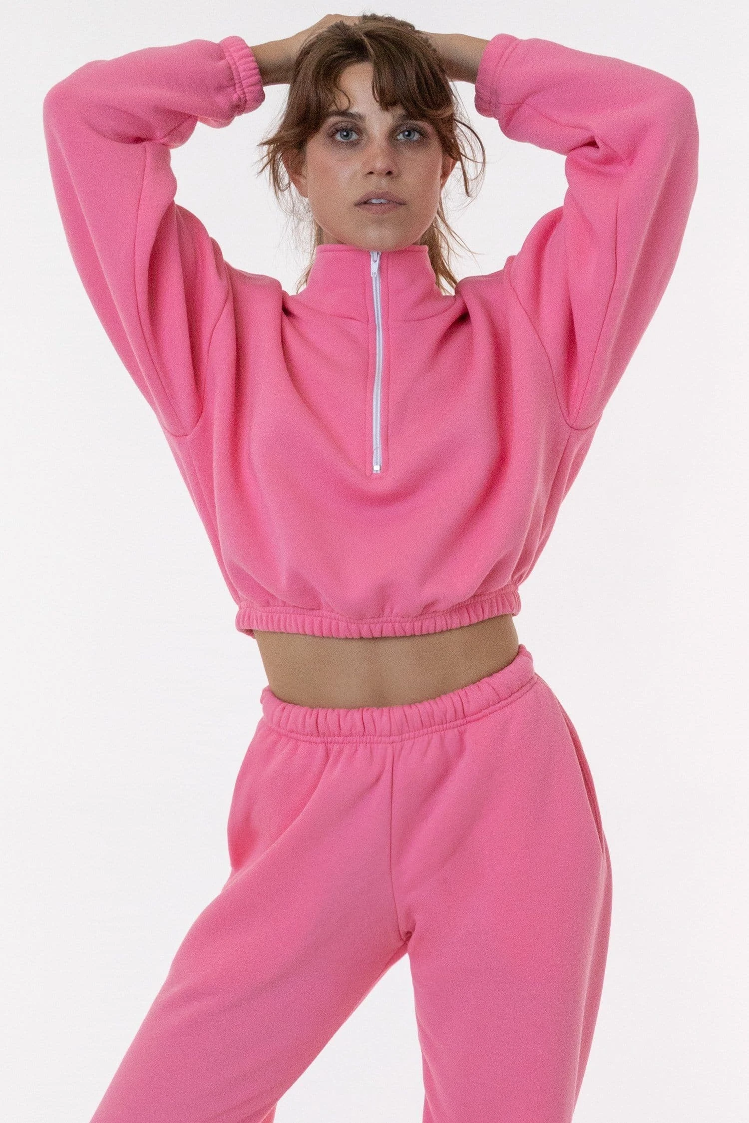 The Flex Fleece Half Zip Cropped Pullover. This pullover features elastic hems around the middle of the waist and at the wrists and this style can be worn zipped up or down. Casual and functional with a generous fit to the body and arms. Perfect for layering over our crop tops and bike shorts. This fleece is soft and comfortable.