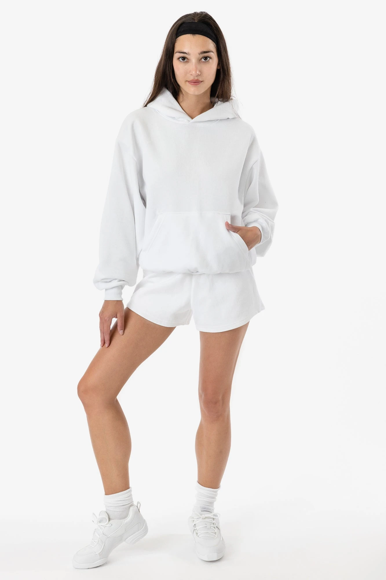 Our new mid-weight, 2-end fleece is made of a 50/50 blend of poly cotton and has a tight knit with minimal stretch. This 10 oz. fleece is an easy, versatile year-round textile. This oversized hoodie has a wide, voluminous fit and features a kangaroo pocket and matching rib cuffs and waistband. This mid-weight fleece is easy to layer in the spring and summer and is an ideal textile for active wear.