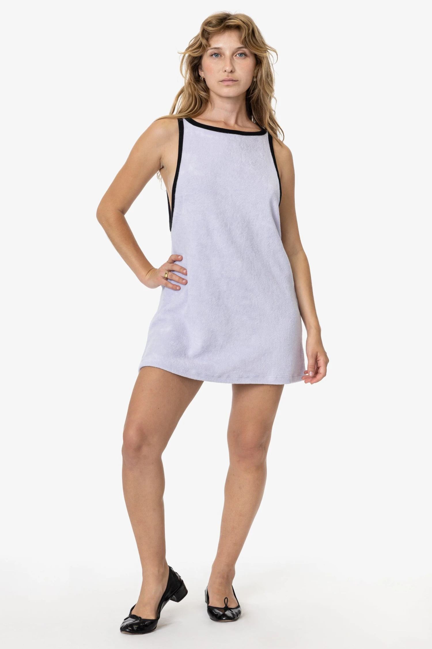 This loop terry dress is an effortless summer piece whether you prefer a sporty look or casual elegance and makes the perfect cover up for the pool or beach. This dress has an a-line silhouette, feminine boatneck and low-cut arm holes for a breezy, flowy fit. Finished with contrasting trim around the neck. Pair with any of our jellies and headbands to complete your look.