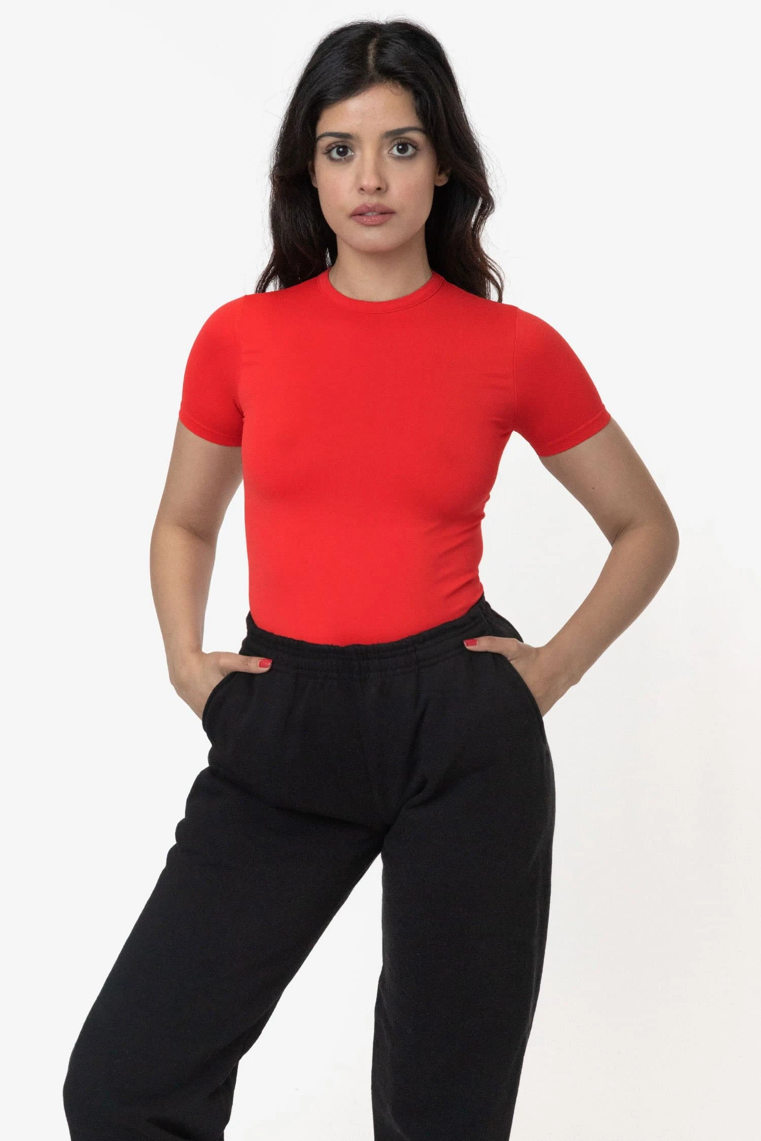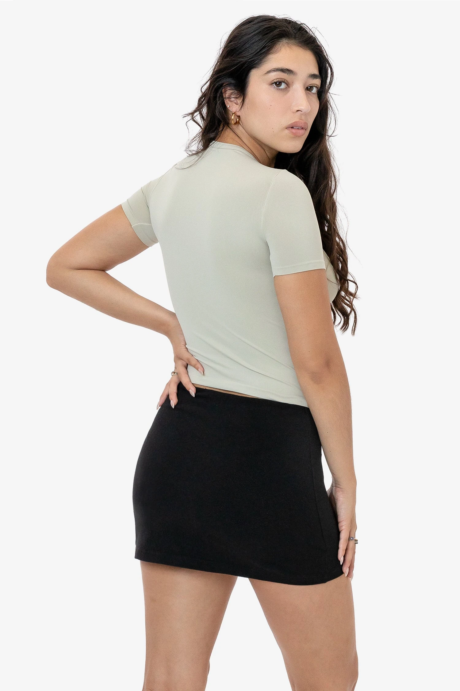 This seamless nylon/spandex baby tee features a mid-length fit, high crew neckline and short sleeves. An everyday sportswear-inspired basic with a super smooth finish and generous stretch for extreme comfort. Try layering this piece with oversized sweatpants and a matching zip up hoodie.