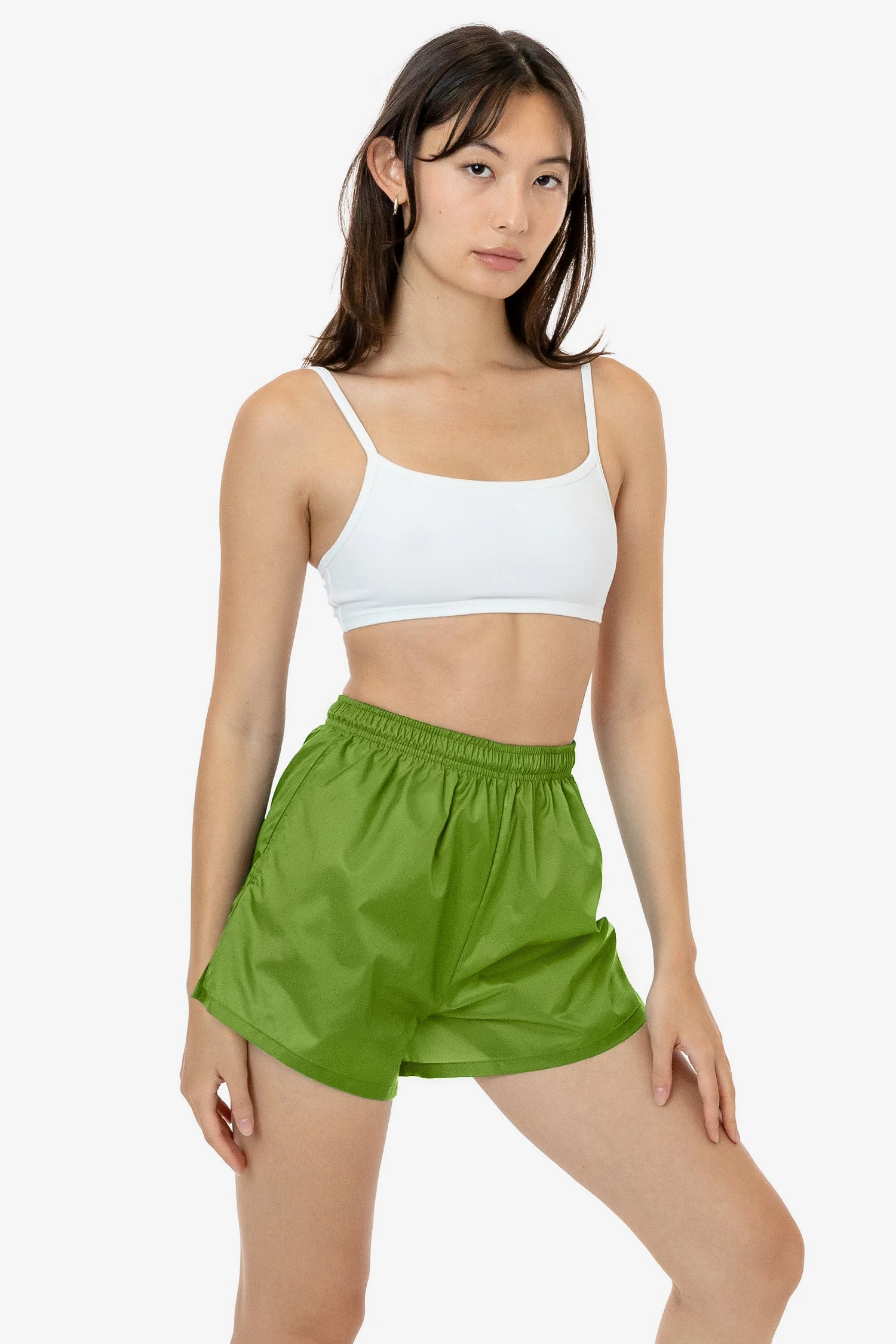 These nylon shorts are a lightweight, statement basic and feature an elastic high-waist fit, and a longer, classic length. These shorts have lined pockets for extra durability and are a perfect short to throw on in the summer. Pair with a crop top or tuck in your favorite tee for a comfortable everyday look.