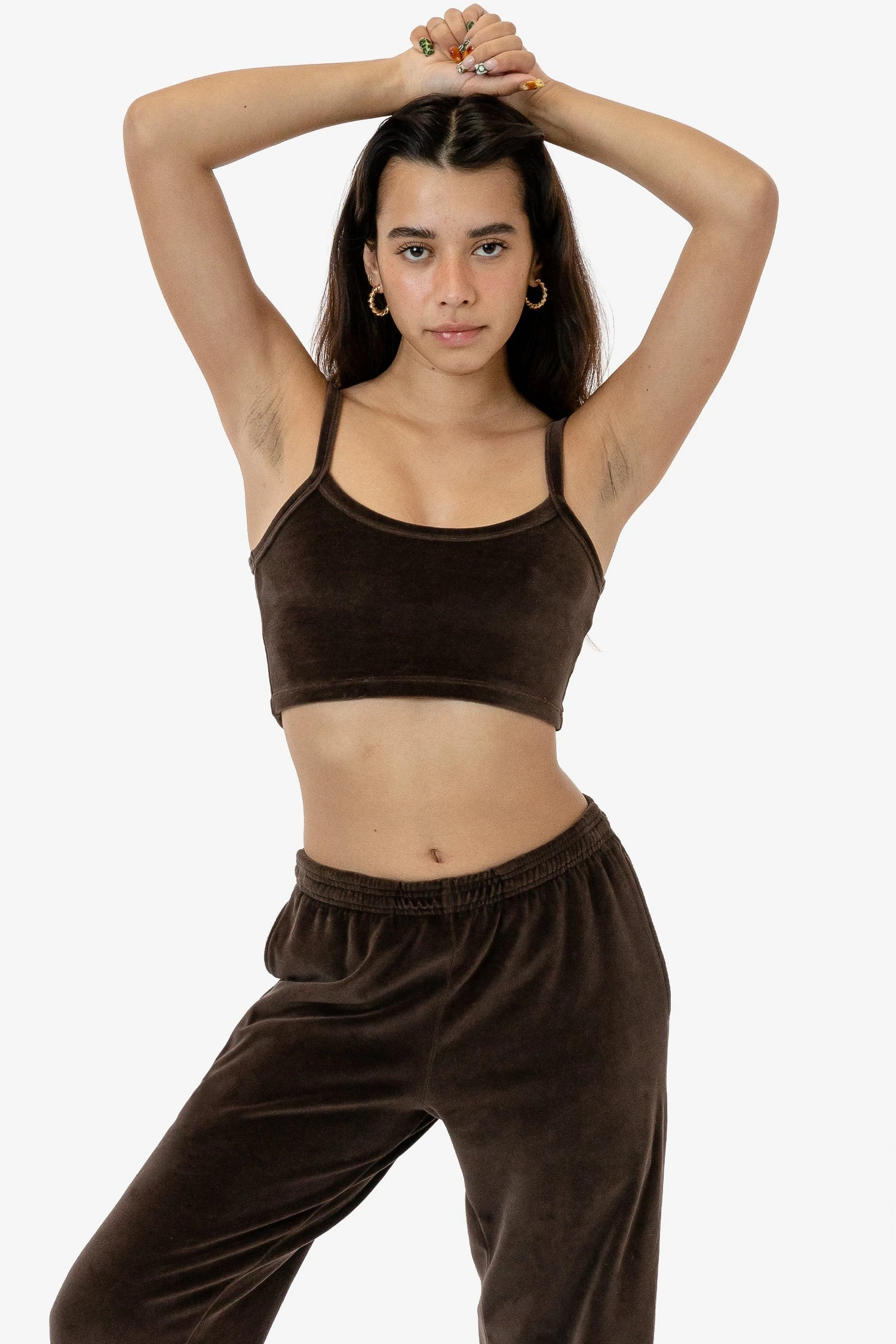 This crop tank is a versatile piece made from a plush velour. This basic silhouette can be dressed up or down or styled with our matching velour lounge pants and hoodie for a head-to-toe, 3-piece look.
