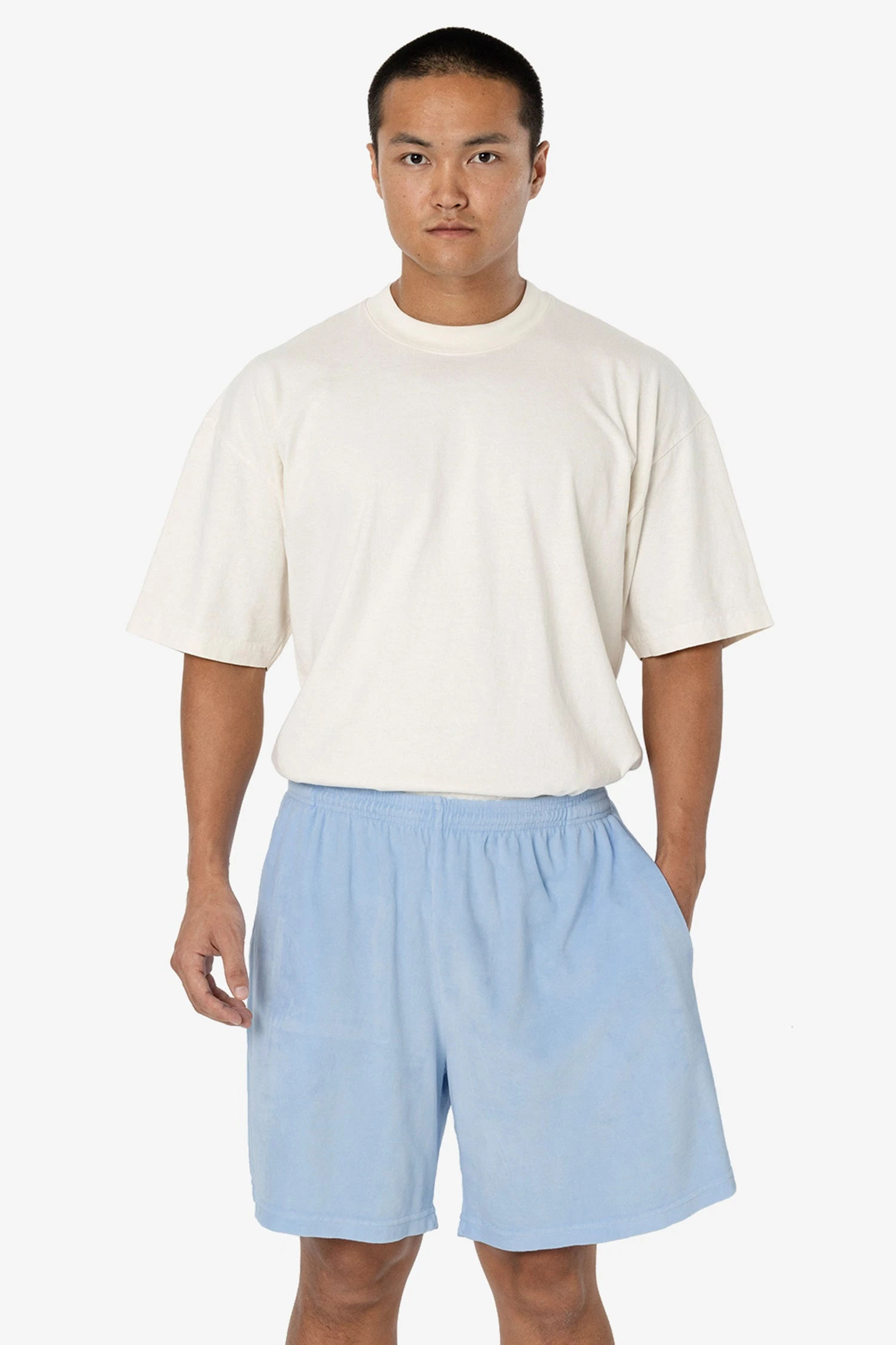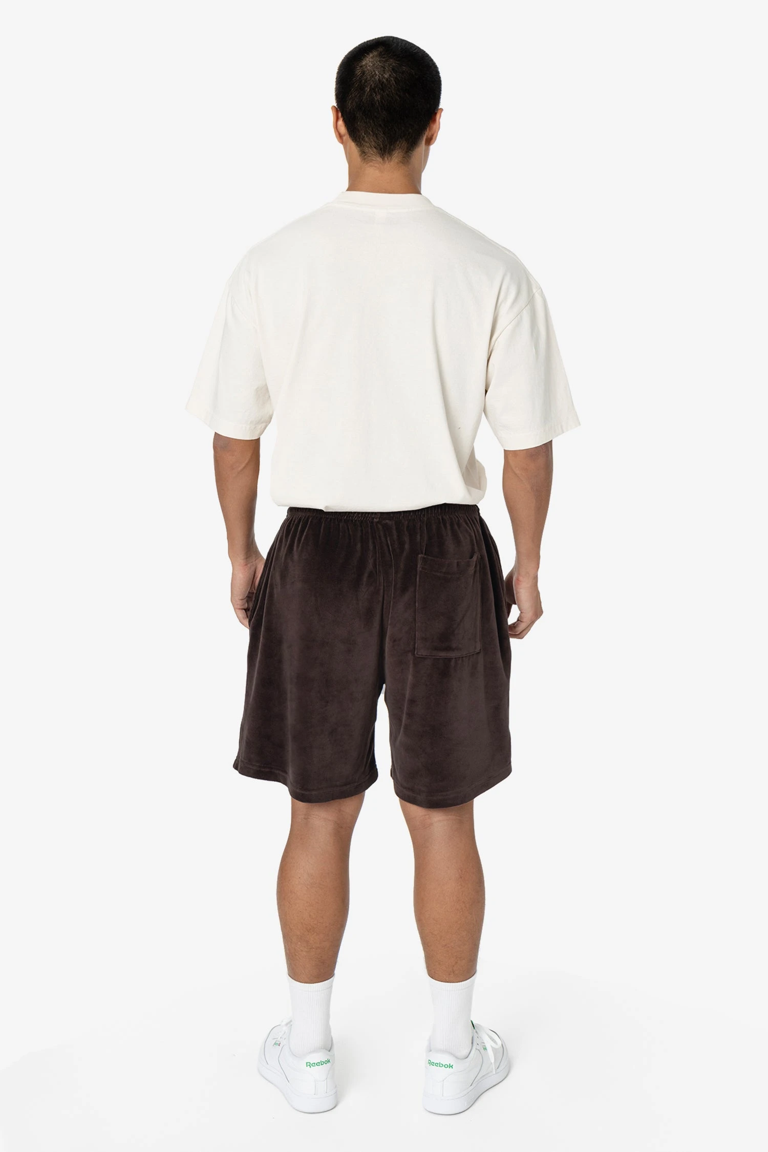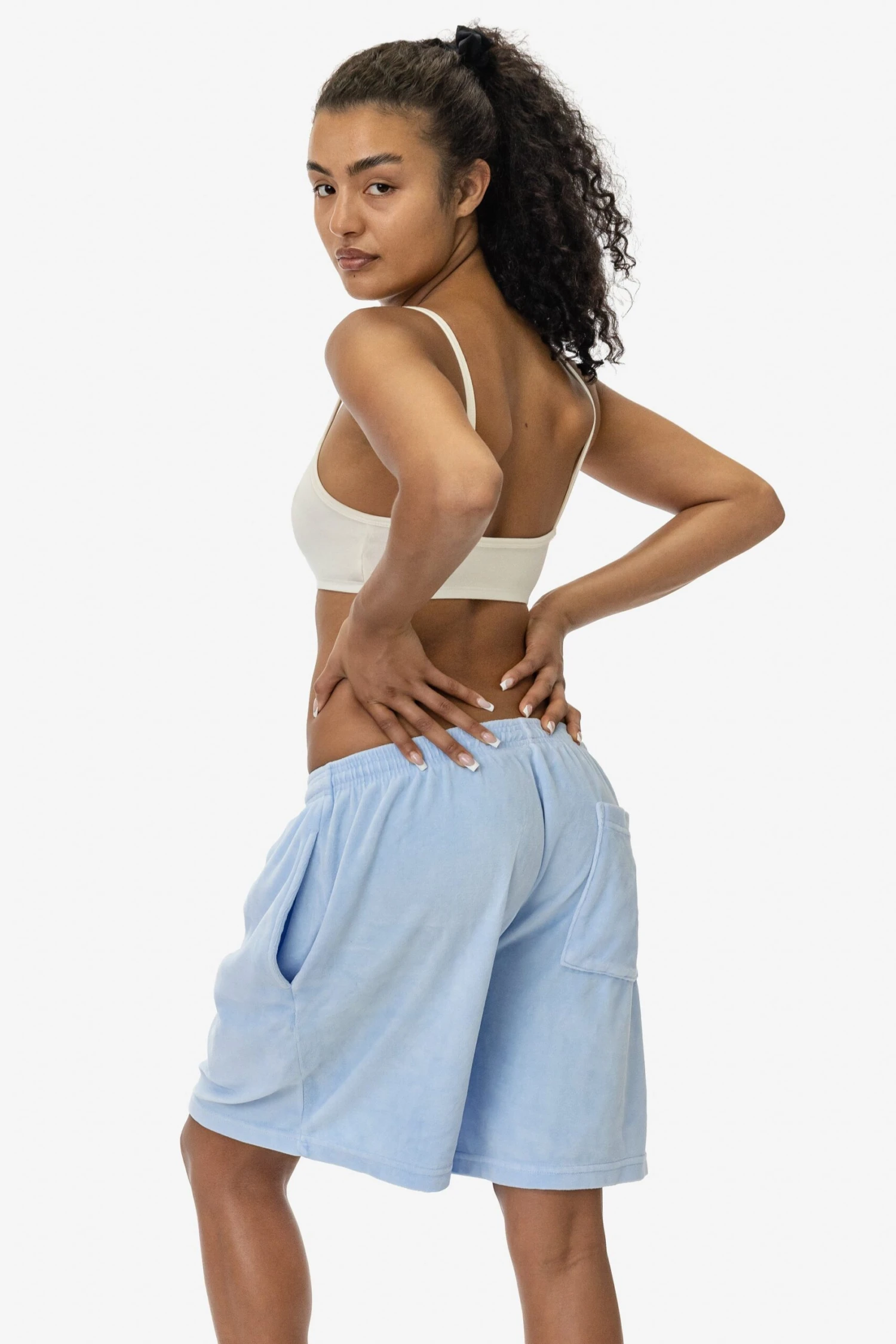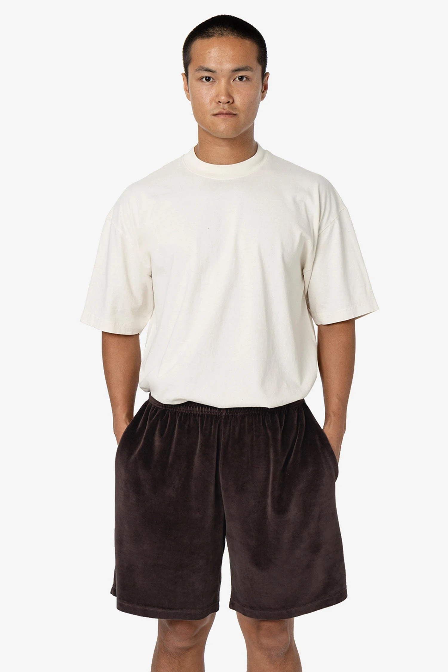Our velour mid-length shorts have a roomy, wide leg and a unisex fit. These shorts have 2 side pockets, one back pocket and an adjustable drawcord inside the elastic waistband. Runs true to size. Women may wish to size down.